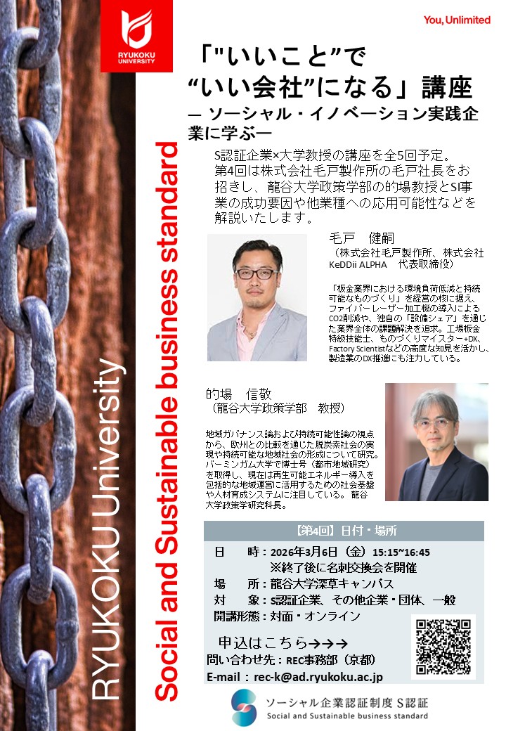 - 京都府リカレント教育推進機構 第4回「”いいこと”で “いい会社”になる」講座 ー ソーシャル・イノベーション実践企業に学ぶー