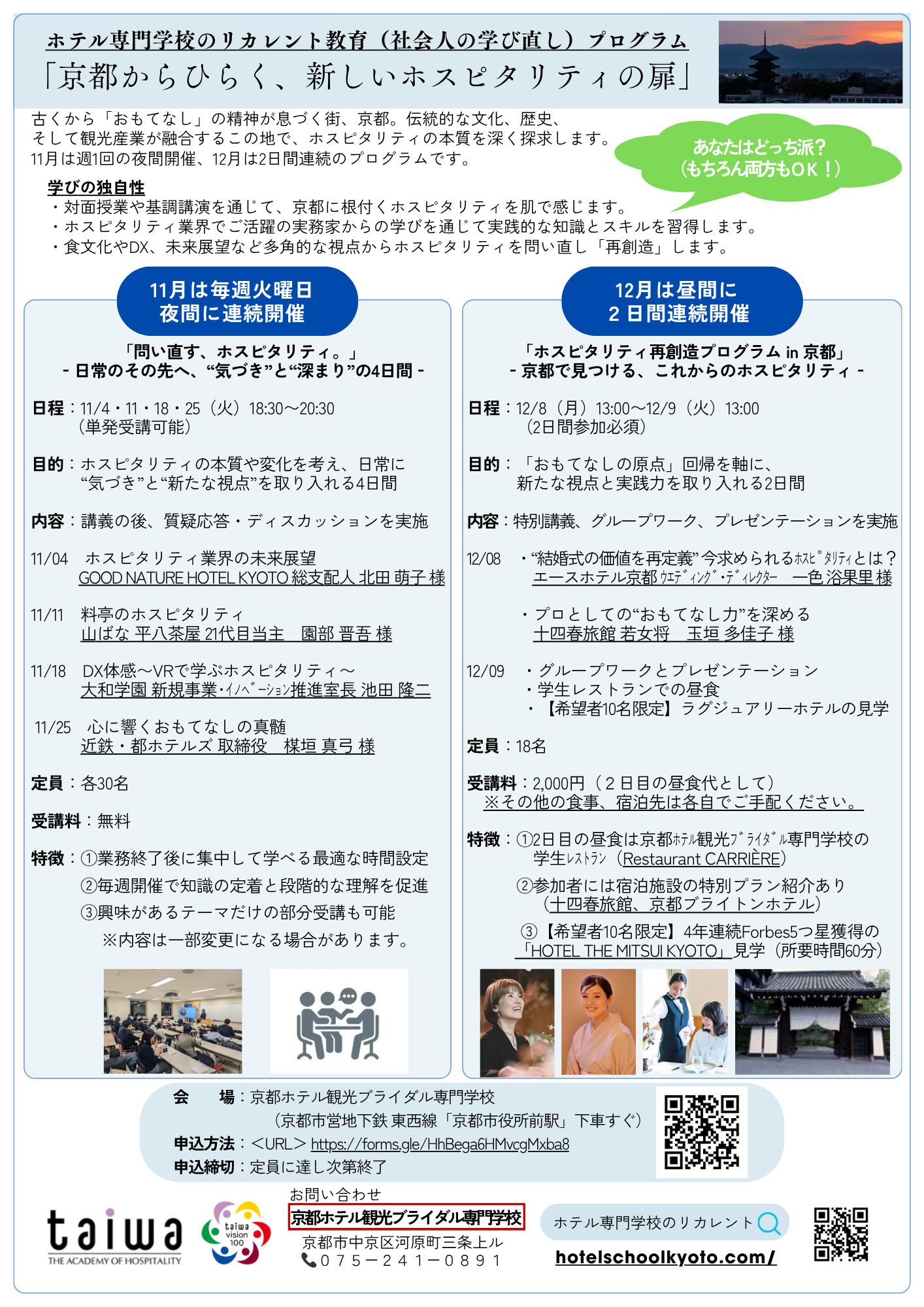 - 京都府リカレント教育推進機構 学び直しプログラム第2弾『京都からひらく、新しいホスピタリティの扉』11月開催