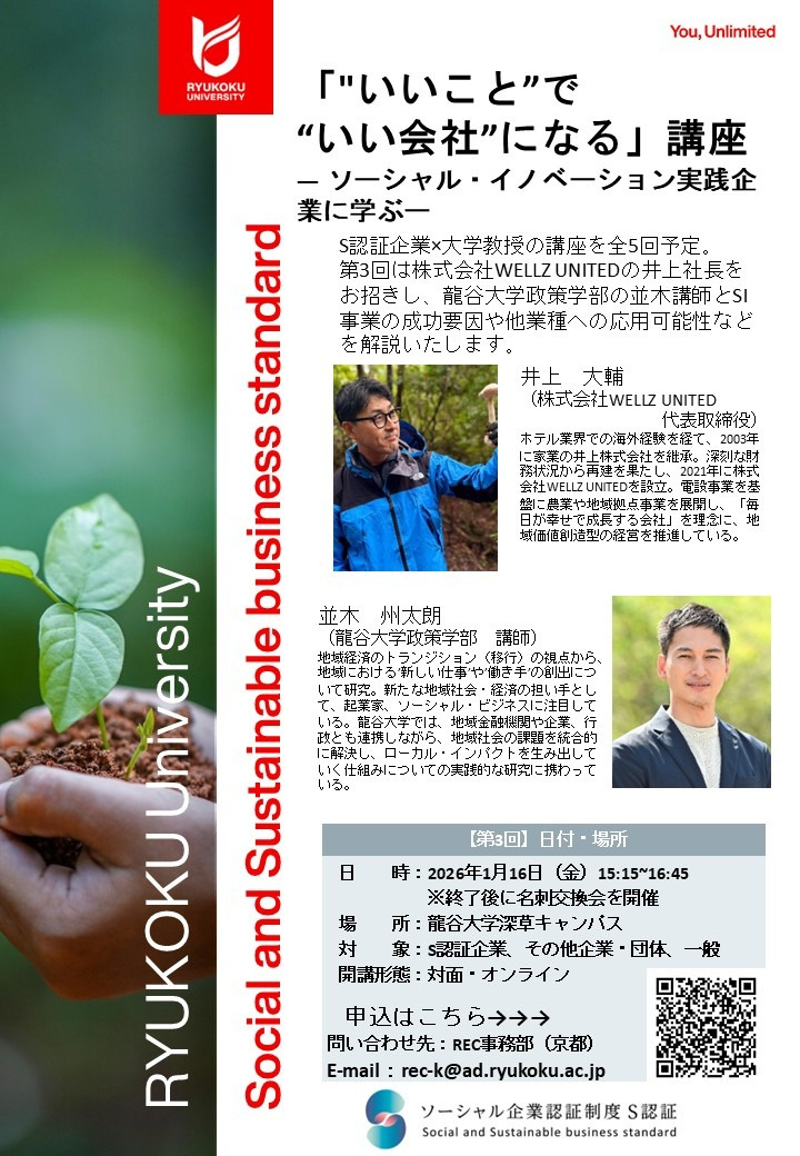 - 京都府リカレント教育推進機構 第3回「”いいこと”で “いい会社”になる」講座 ー ソーシャル・イノベーション実践企業に学ぶー