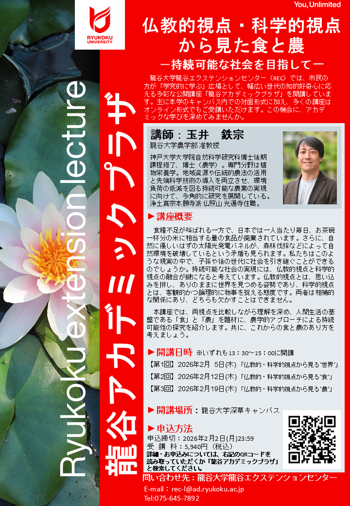 - 京都府リカレント教育推進機構 【龍谷アカデミックプラザ】仏教的視点・科学的視点から見た食と農-持続可能な社会を目指して-