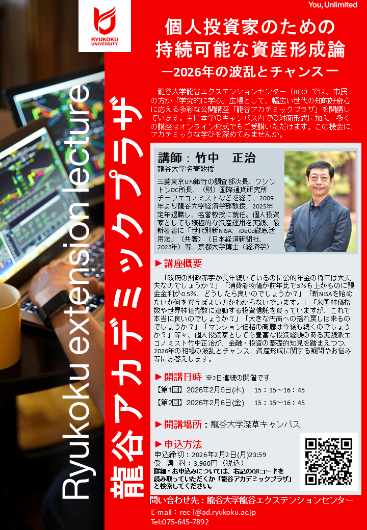- 京都府リカレント教育推進機構 【龍谷アカデミックプラザ】個人投資家のための持続可能な資産形成論-2026年の波乱とチャンスー