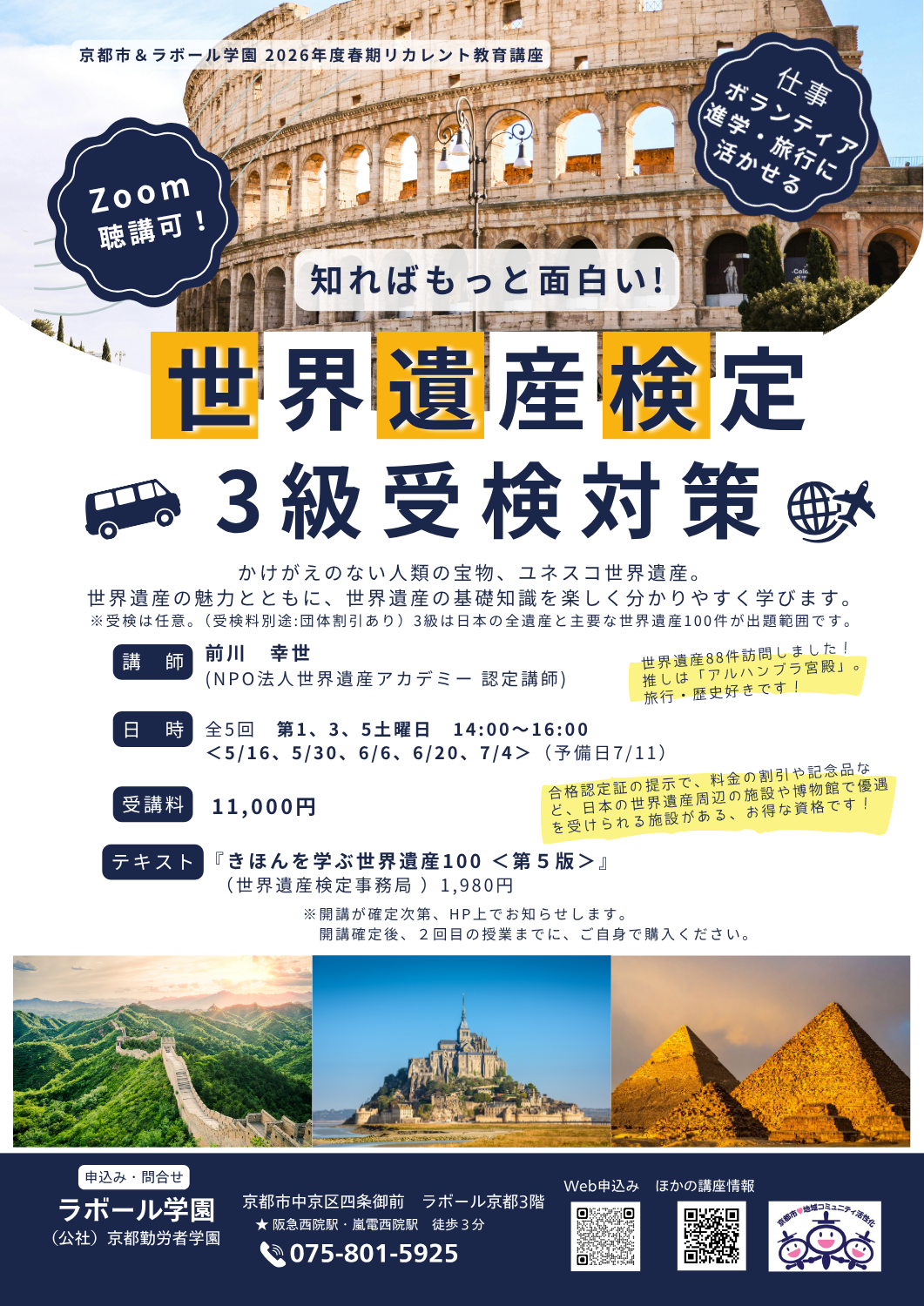 Zoom聴講もOKのため、自宅からの受講も可能です。3級では、日本にある全ての世界遺産と主な世界遺産100件が対象となります。国内の世界遺産周辺の施設や博物館には、合格認定証の提示で割引きや記念品を受けられる所もあります。