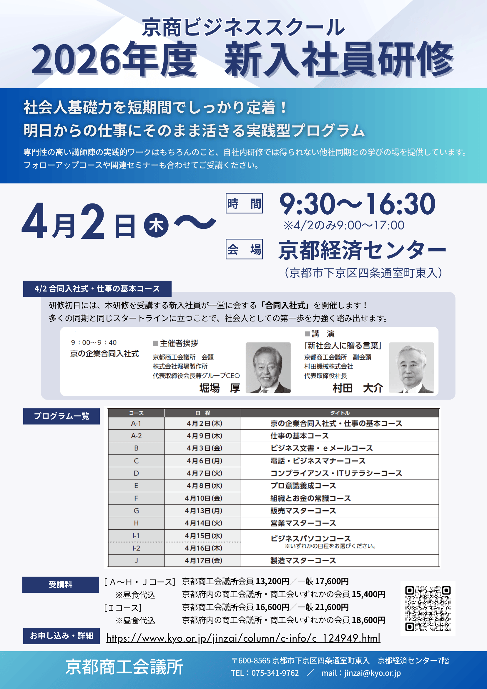 京都商工会議所では、毎年ご好評いただいている「新入社員研修」を今年も開催いたします。